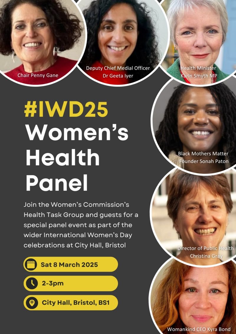 Women’s Commission Chair Penny Gane, who also co-chairs the Women’s Health Task Group, will be joined by expert speakers including: Minister for Health & Social Care Karin Smyth, Bristol, North Somerset and South Gloucestershire’s Integrated Care Board (BNSSG ICB)’s Deputy Chief Medical Officer Dr Geeta Iyer, Director of Public Health Christina Gray, Black Mothers Matter Founder Sonah Paton and Womankind CEO Kyra Bond.